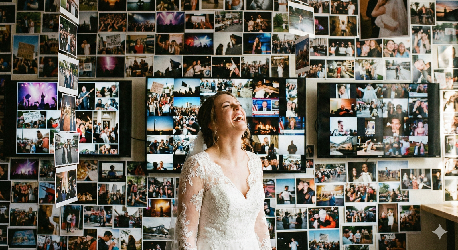 A cinematic shot of a bride laughing amidst a chaotic grid of thousands of unrelated event photos....