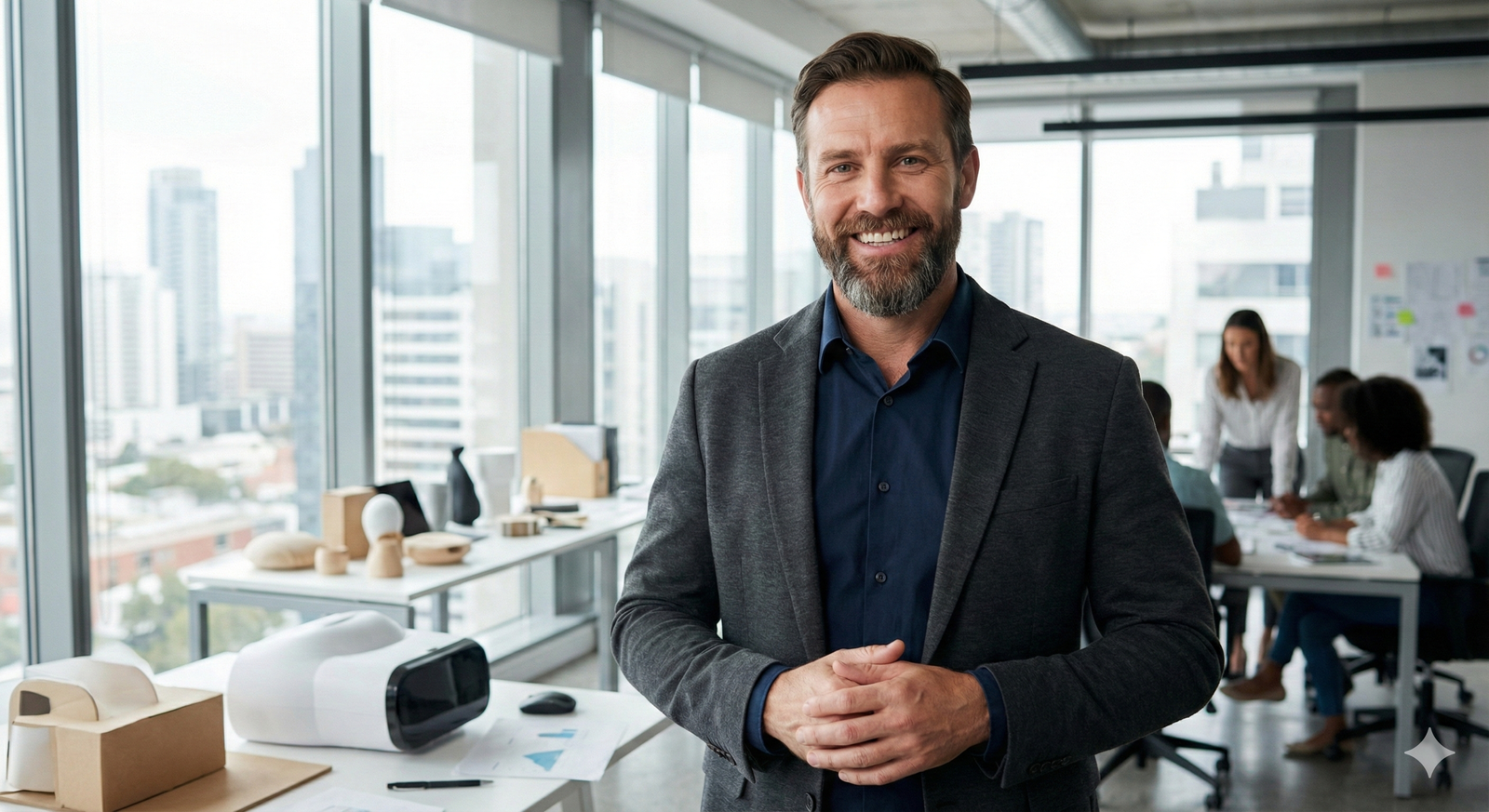 A confident shot of a male entrepreneur in a modern studio, looking proudly at the camera....