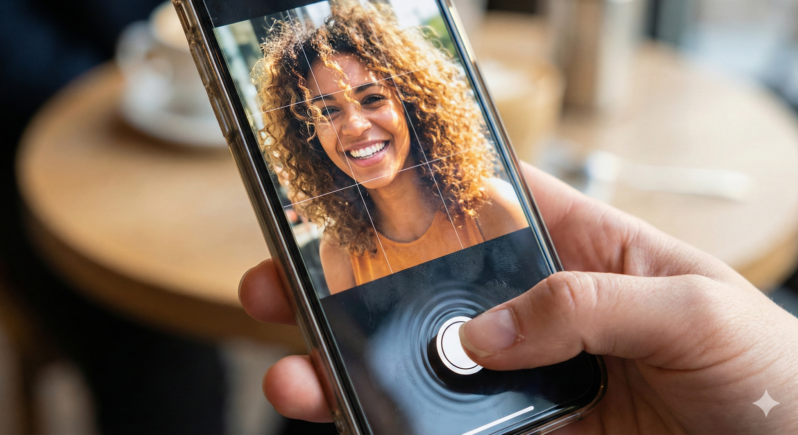 Close-up of a modern smartphone held naturally. A generic, friendly woman's face appears inside...