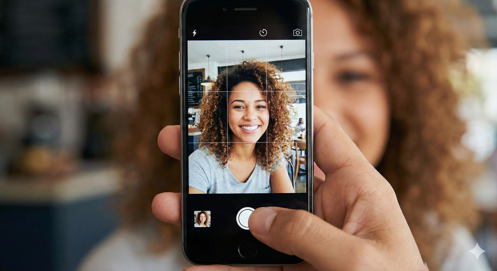 Instant transition to the phone screen now showing only photos of the same woman. No distractions in...